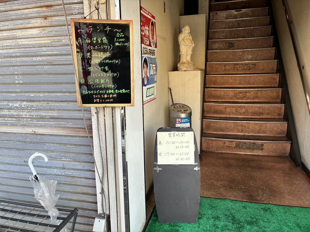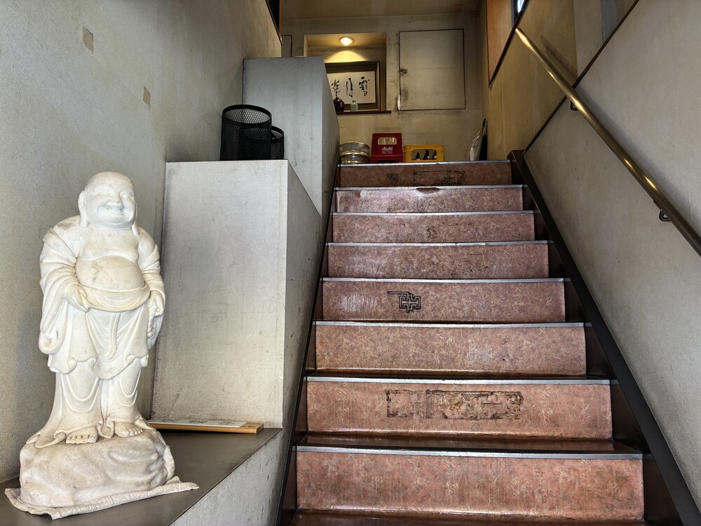 お店の外観を見たときは、正直なところ「昔ながらの町中華かな」という印象を受けました。ところが、階段を上がって2階の店内に足を踏み入れると、その印象は一変します。入口には福を招く布袋様の白い置物が出迎えてくれました。