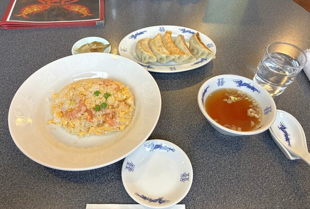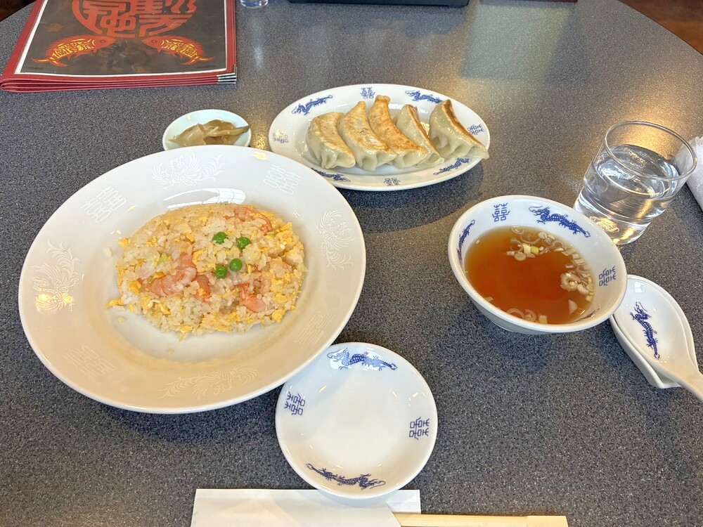 今回注文したのは、エビチャーハンと餃子(5個)のセット。ランチメニューは魅力的でしたが、メニュー表を見ていてどうしても気になってしまいました。龍の絵柄が描かれた食器で料理が運ばれてきた瞬間、期待が高まります。