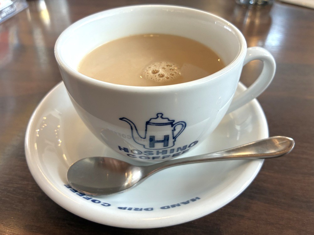 HOSHINO COFFEEのロゴが入った白いカップは丸みがあって、手に収めると温かさがじんわり伝わってきます。