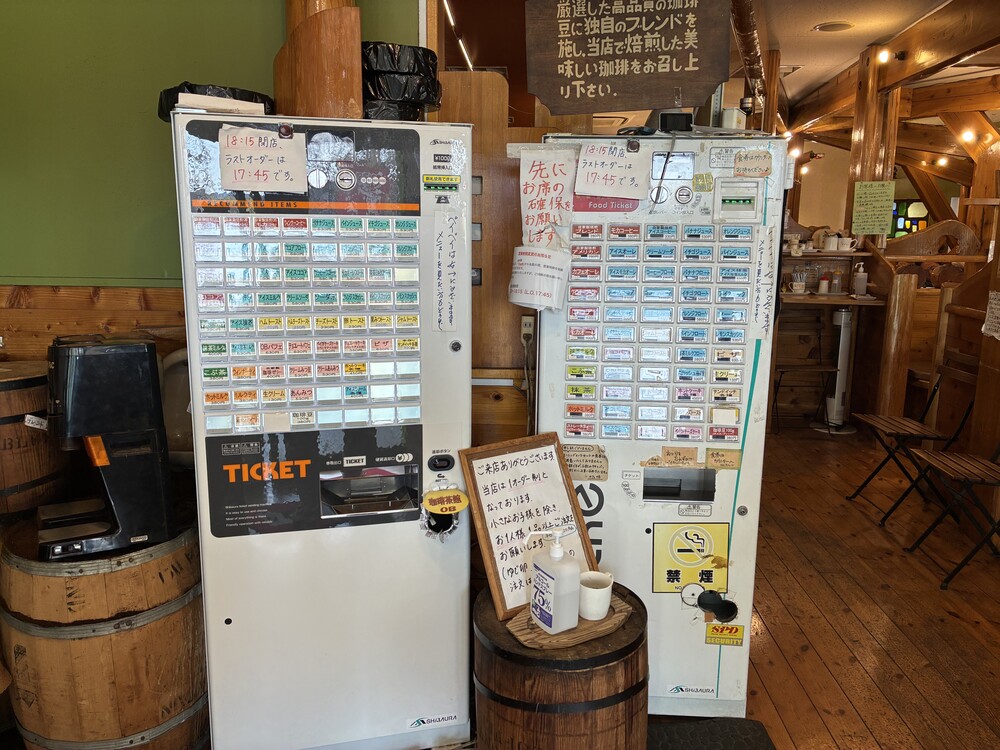 店内に入ると、まず目に飛び込んでくるのが2台の券売機。珈琲屋OB久喜店はセルフサービス方式を採用しており、食券を購入してカウンターに渡すスタイルです。出来上がるとブザーが鳴るので、受け取りに行くだけ。