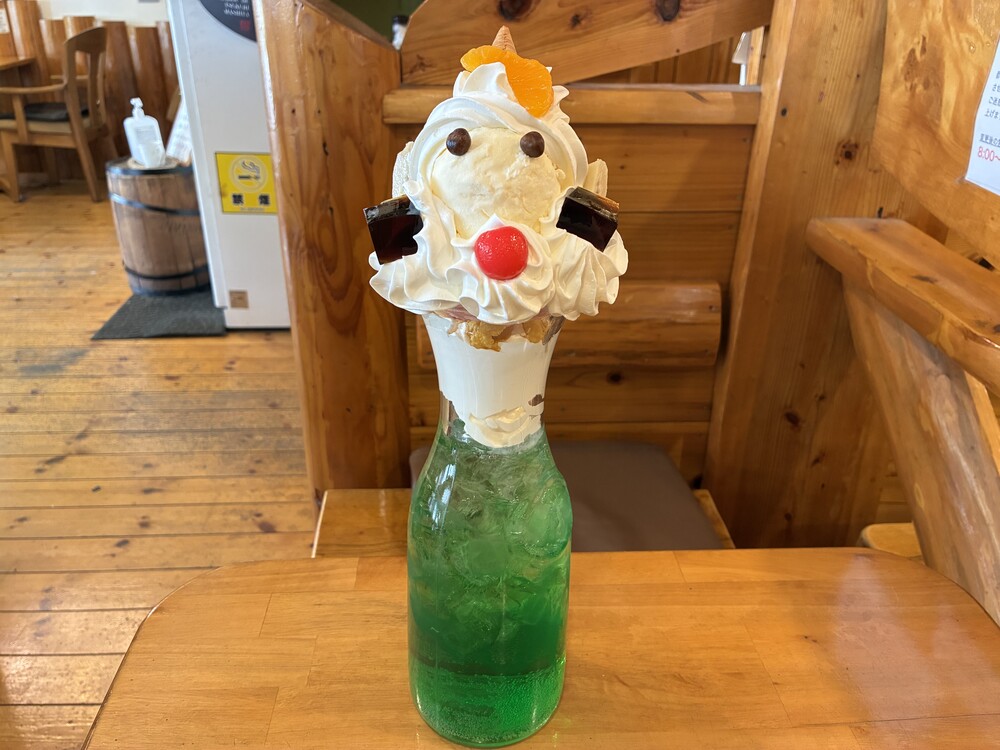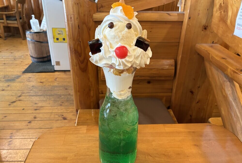 運ばれてきた瞬間、思わず笑顔になってしまいました。鮮やかなグリーンのメロンソーダの上に、なんとピエロの顔を模したデコレーションがのっています。チョコレートの目、真っ赤なチェリーの鼻、頭にはオレンジ、そして両手のようにチョコレートが添えられた姿は、まるでこちらに手を振っているよう。