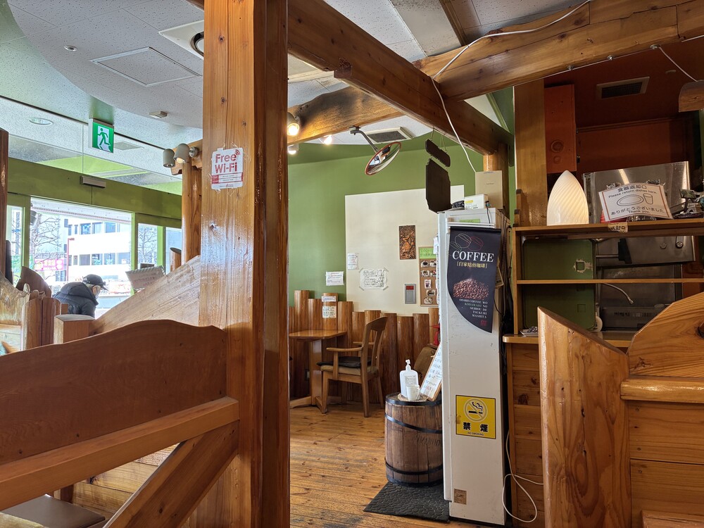 珈琲屋OBの店内は、木材をふんだんに使ったログハウス風のつくり。温かみのある空間が広がっていて、入った瞬間にホッとした気持ちになれます。