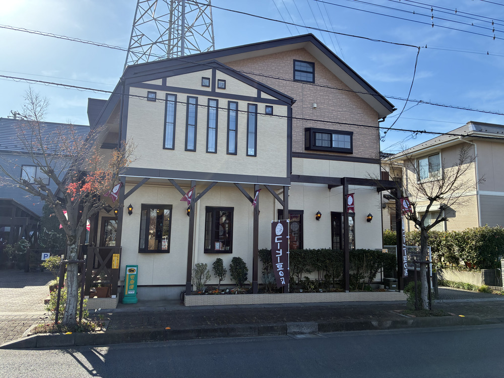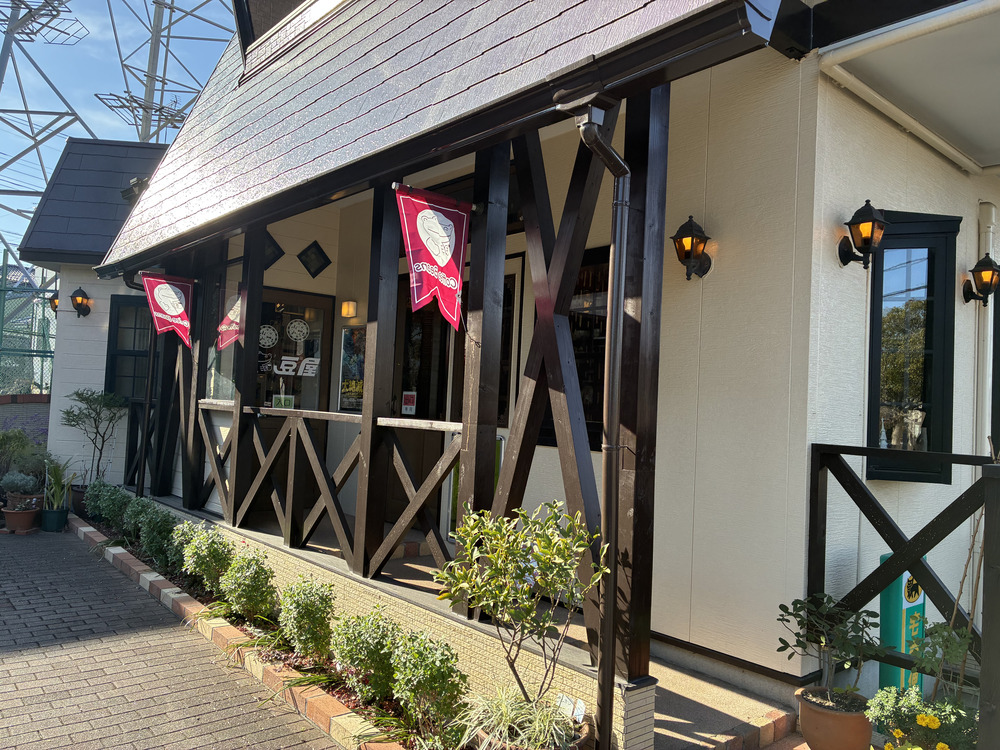 クリーム色の壁にダークブラウンの木組みが映える、洋風の建物が目印。「コーヒー豆の店」と書かれたえんじ色ののぼりが風に揺れていて、遠くからでもすぐに見つけられました。