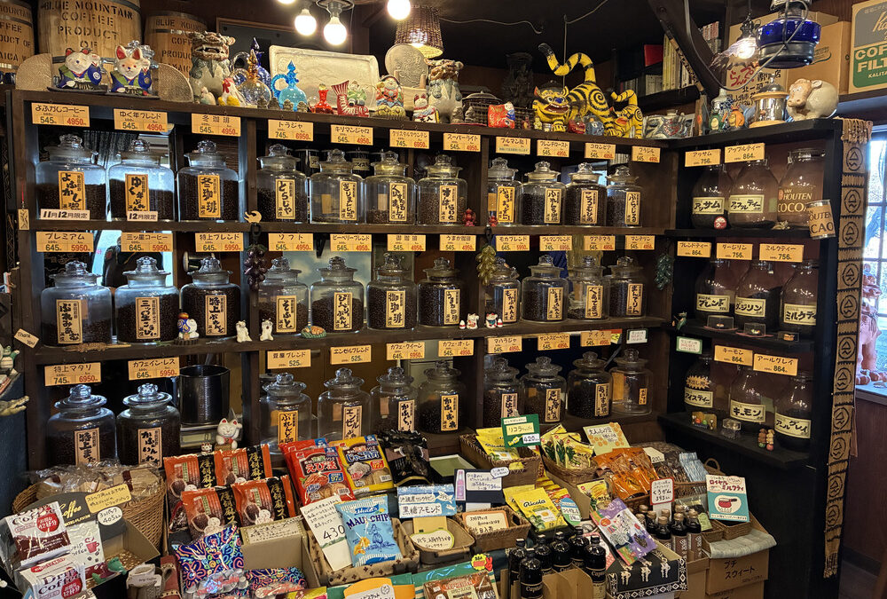 店内には、ガラス瓶に入った珈琲豆がずらりと並んでいて、その光景は圧巻のひとこと。ブラジル、コロンビア、エチオピアなどの定番から、トラジャやマンデリンといった希少な銘柄まで、種類の豊富さに目移りしてしまいます。