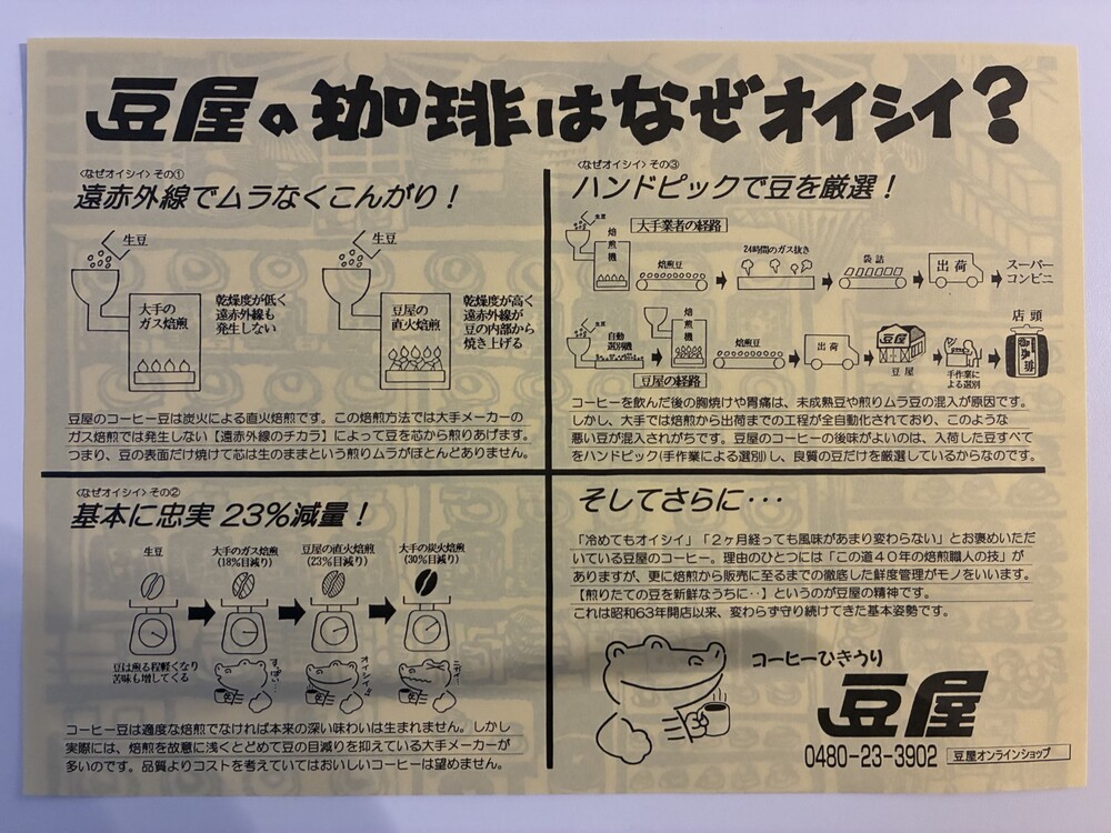豆屋の珈琲がおいしい理由、気になりませんか?お店でいただいたチラシに、その秘密が書かれていました。
