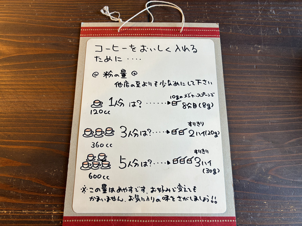 豆屋の珈琲豆は、他店のものより少なめの粉量がおすすめとのこと。1人分(120cc)で10gのメジャースプーン8分目(約8g)が目安だそう。3人分なら20g、5人分でも30gで十分なんですって。