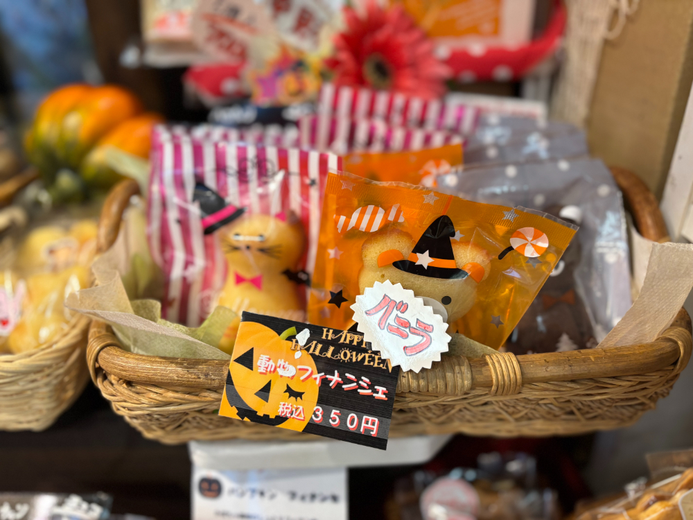 コンパクトな店内には、焼き菓子やフィナンシェなどが所狭しと並び、棚全体がハロウィンの装飾で彩られています。