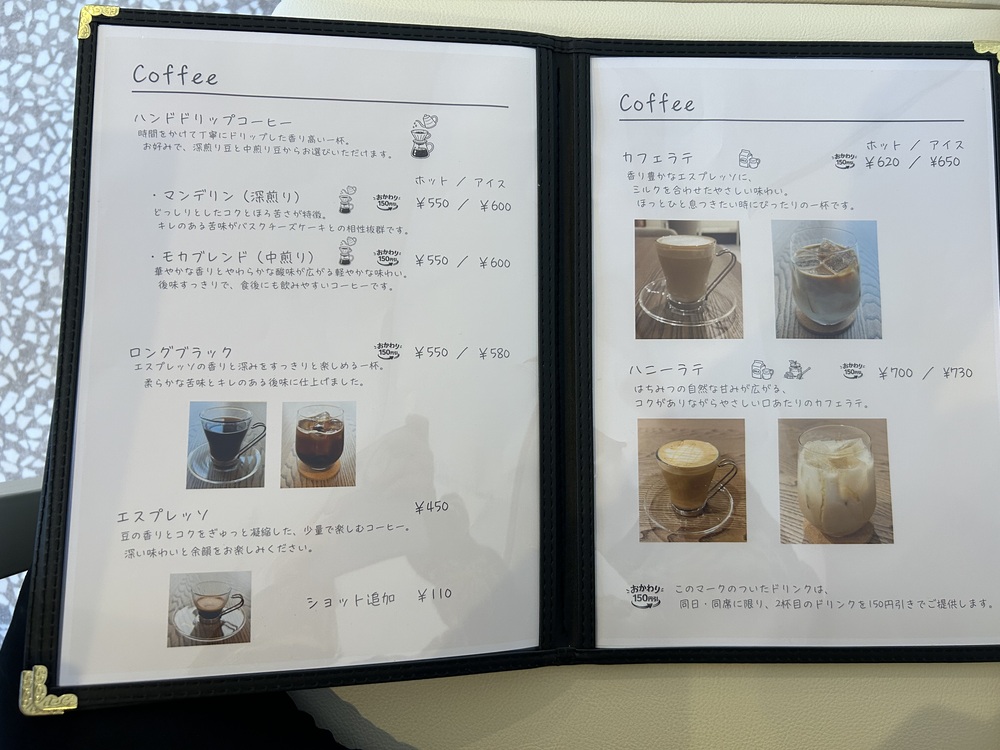 コーヒーは一杯ずつ丁寧に淹れるハンドドリップも選べます。
