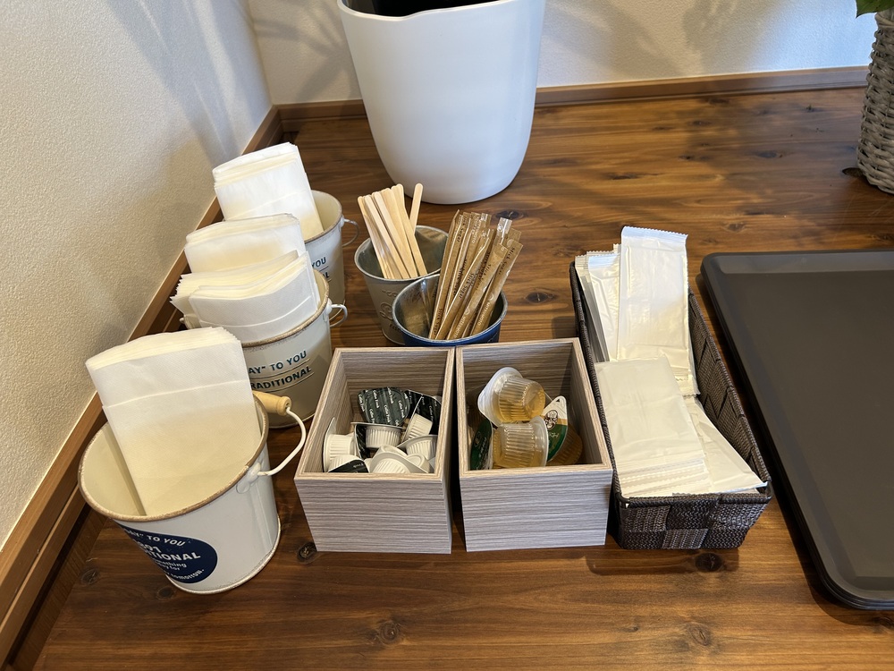 注文はカウンターで先に済ませるスタイルで、お水やミルク、砂糖などはセルフサービスとなっています。