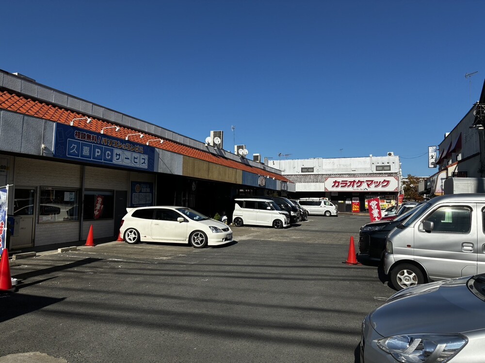 久喜駅西口を出て、徒歩約5分ほど歩くと「らーめんさくら」が見えてきます。カラオケ店の近くにあり、桜の花びらが散りばめられたピンク色の看板が目印です。