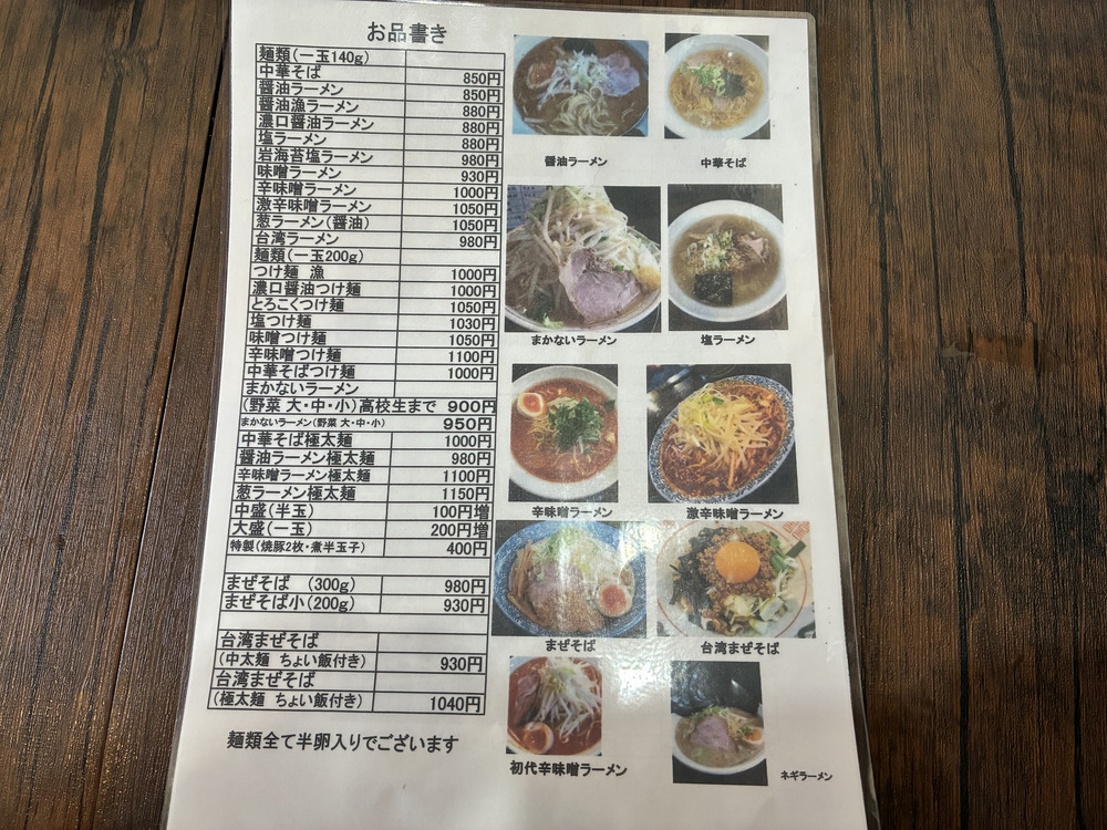 麺類だけでも、中華そば、醤油ラーメン、まかないラーメン、塩ラーメン、味噌ラーメン、つけ麺、台湾まぜそば、ネギラーメンなど種類が豊富です。