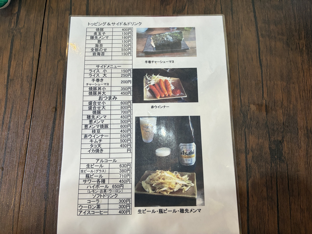 サイドメニューも充実しています。手巻きチャーシューマヨ、焼豚丼、おつまみなど、お酒のお供にぴったりなメニューも揃っています。