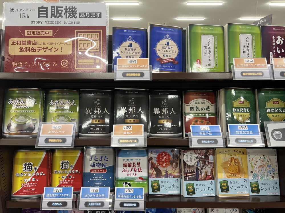 たとえば、正和堂書店とPHP文芸文庫がコラボした限定ブックカバーがついている、「自販機あります」と掲げられたコーナー。