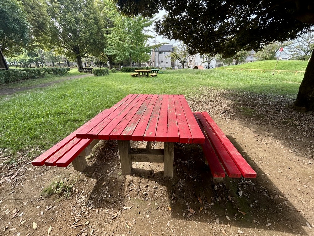 砂場の近くには赤色が目を引くベンチがあります。